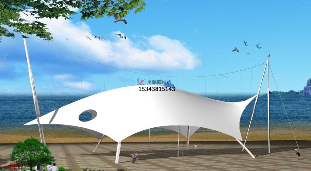以膜材、鋼索及支柱構(gòu)成,利用鋼索與支柱在膜材中導(dǎo)入張力以達(dá)安 定的形式。除了可實(shí)踐具創(chuàng)意,創(chuàng)新且美觀的造型外,也是比較能展現(xiàn)膜結(jié) 構(gòu)精神的構(gòu)造形式。 大型跨距空間也多采用以鋼索與壓縮材構(gòu)成鋼索網(wǎng)來支撐上部膜材的形式。因施工精度要求]高,結(jié)構(gòu)性能強(qiáng),且具豐 富的表現(xiàn)力,所以造價(jià)略高于骨架式景觀膜結(jié)構(gòu)遮陽棚。