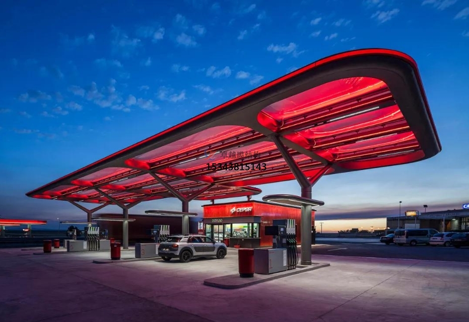 豐富的色彩選擇:膜材可以根據(jù)客戶的需求,染成各種不同的顏色,滿足加油站對個(gè)性化和品牌形象展示的需求。通過色彩的搭配和組合,能夠營造出不同的氛圍和視覺效果,提升加油站的整體形象和辨識度。例如,一些知名品牌的加油站,通過采用統(tǒng)一的膜結(jié)構(gòu)罩棚顏色和造型,強(qiáng)化了品牌的視覺識別度。