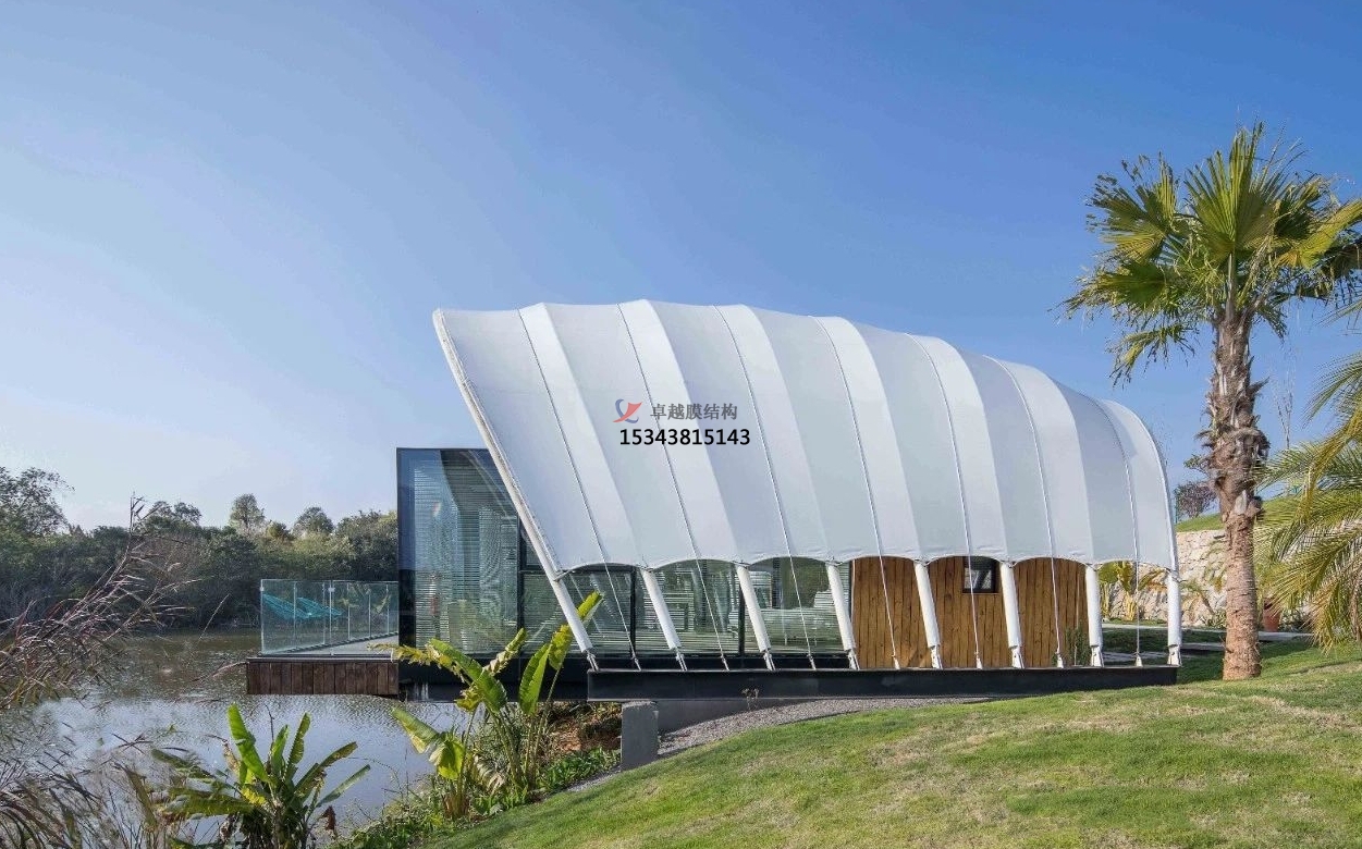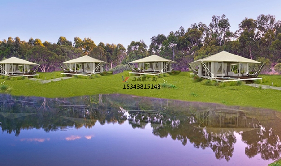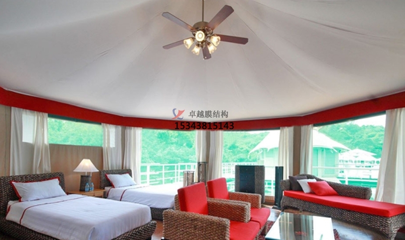膜結(jié)構(gòu)帳篷酒店膜材是一種無(wú)毒的高分子材料。它具有無(wú)味的特點(diǎn),安裝后沒(méi)有一絲味道。另外,它擁有抗紫外線和反射光線極強(qiáng)的特點(diǎn),而且其抗撕裂的性能強(qiáng),還有B1/M2級(jí)別的阻燃性能,并且使用壽命極強(qiáng),一般壽命都在20年以上。