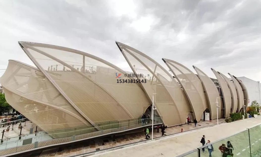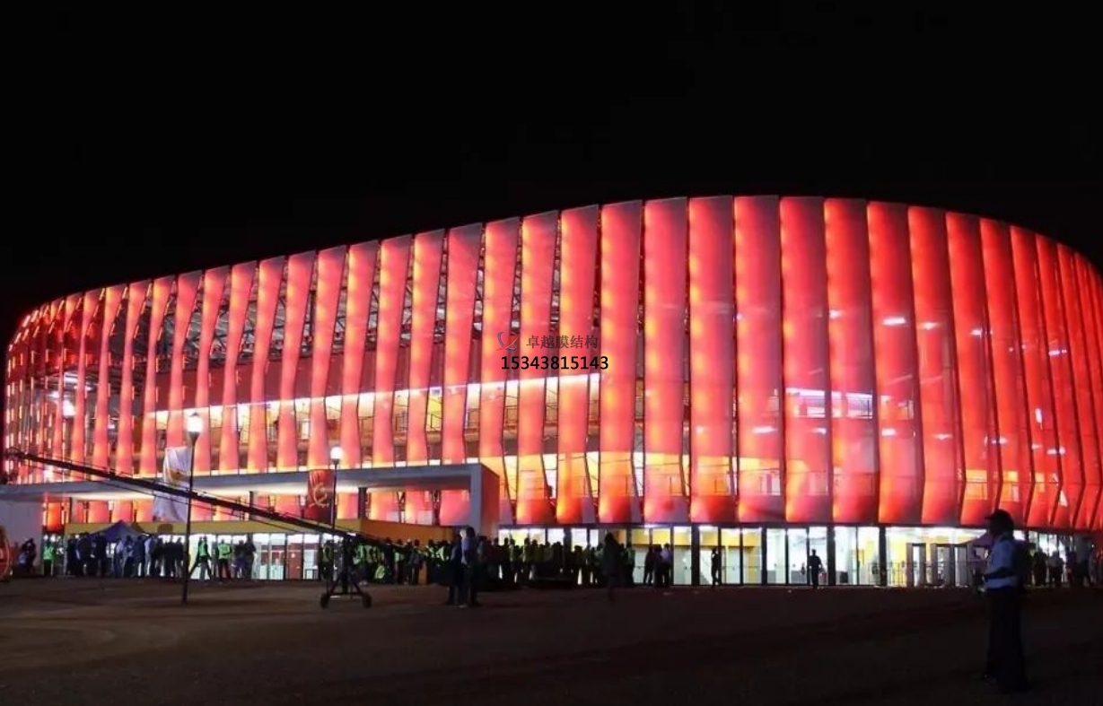 膜材是在聚酯纖維編織成的基布上涂敷PVC(聚氯乙烯)樹(shù)脂而形成的復(fù)合材料,非常的具有技術(shù)含量,其曲面可以隨著建筑師的設(shè)計(jì)需要任意變化,結(jié)合整體環(huán)境,建造出標(biāo)志性的形象工程。