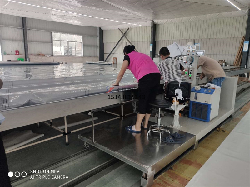 無塵焊接中,膜材在平臺固定,軌道機滑動焊接。