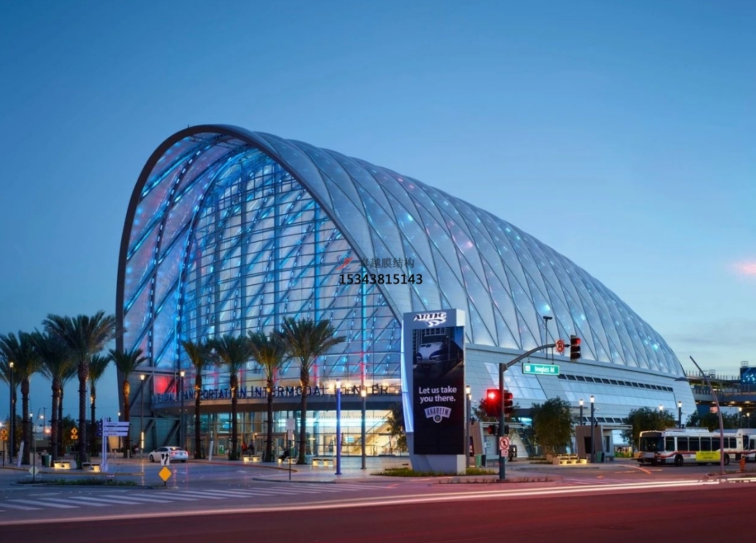 ETFE設(shè)計(jì)強(qiáng)度低,單層ETFE適用于跨度較小的結(jié)構(gòu),比較典型的應(yīng)用是設(shè)置于桁架弦桿之間,形成采光帶,且通過ETFE與PVC/PTFE不同材質(zhì)的組合使用,產(chǎn)生更為豐富的視覺效果。