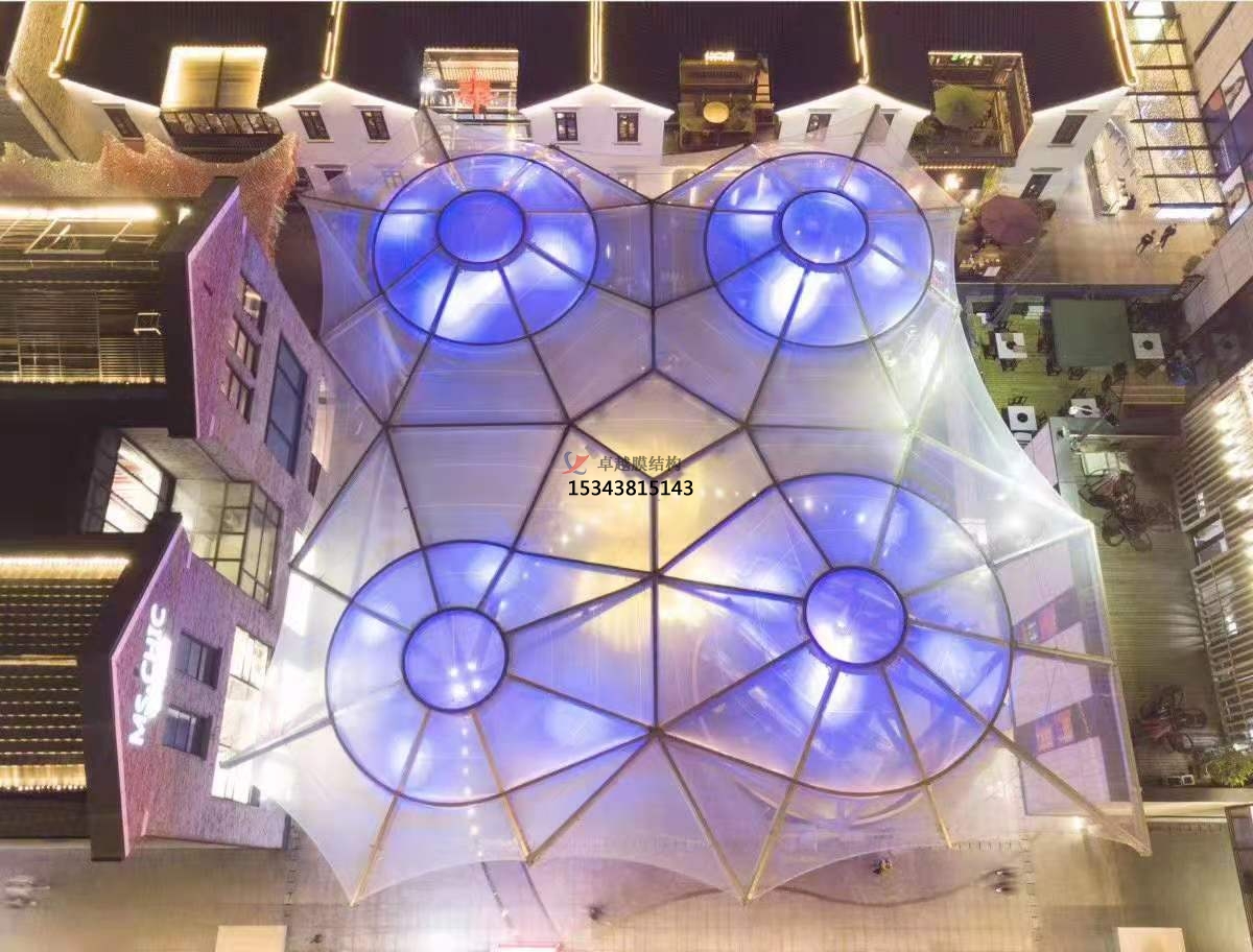 4、PTFE 膜材料特點(diǎn)說明:PTFE膜材料的織物基材為玻璃纖維,纖維的直徑范圍應(yīng)在3.30~4.05μm 范圍內(nèi),重量應(yīng)大于150g/m。<涂層的主要材料應(yīng)為聚四氟乙烯樹脂,含量應(yīng)不低于90%,涂層的重量在應(yīng)大于400g/m。PTFE膜材料的厚度宜大于0.5mm。能防止化學(xué)腐蝕和紫外線侵蝕,不易老化,在雨水中具有自潔性能