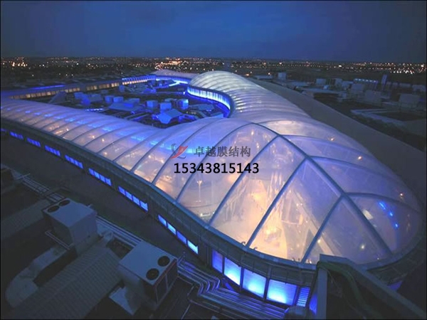 ETFE是乙烯和聚四氟乙烯的共聚物,屬結(jié)晶性高聚物。這種材料具有高強(qiáng)度、耐腐蝕、耐老化、化學(xué)穩(wěn)定性好等突出特點(diǎn)。人們將ETFE材料壓制成很薄的膜,這種膜材不僅具有很高的強(qiáng)度,而且是透明的蒸汽透過率很低,因而可將兩層膜復(fù)合到一起,中間充入空氣形成氣枕,包裹在建筑物外表面,便形成了一種具有高保溫性能的透明輕質(zhì)的建筑圍護(hù)結(jié)構(gòu)。尤其對于大跨度封閉式建筑,是一種很好的屋面和墻面圍護(hù)結(jié)構(gòu)材料。