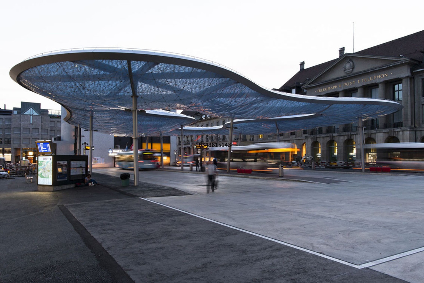 在瑞士,有一個(gè)公交車站因它的雨棚而出名。這個(gè)雨棚由許多個(gè)ETFE氣枕組成,更終形成一個(gè)云朵的樣子。給上下班通勤來往的打工人提供了一個(gè)短暫的港灣。