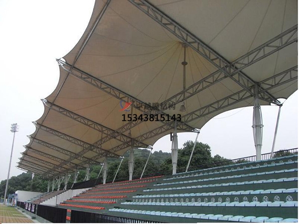 (2)輕巧、美觀的膜結(jié)構(gòu)特別適用于開(kāi)放式或半開(kāi)放式建筑物的遮蔽屋頂。近幾年來(lái),在足球、田徑等賽場(chǎng)上,越來(lái)越多的看臺(tái)挑棚采用膜結(jié)構(gòu)。外國(guó)許多露天劇院的舞臺(tái)、展示廳也都采用膜材作頂蓋。膜結(jié)構(gòu)也可以在我國(guó)廣大地區(qū)的農(nóng)貿(mào)市場(chǎng)大力推廣。