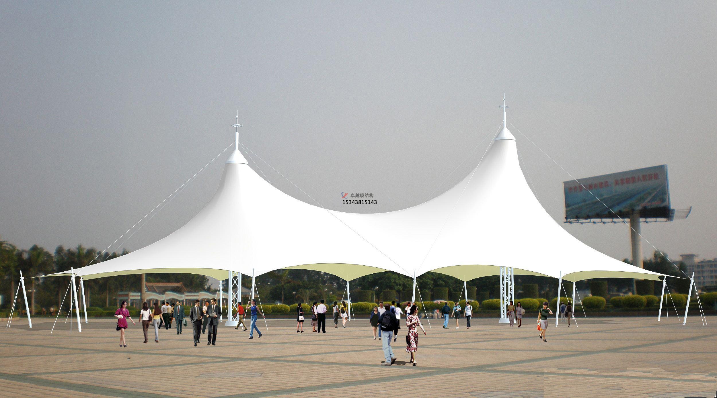 膜結(jié)構(gòu)景觀是建筑結(jié)構(gòu)中更新發(fā)展起來的一種形式,它以性能優(yōu)良的織物為材料,或是向膜內(nèi)充氣,由空氣壓力支撐膜面,或是利用柔性鋼索或剛性支撐結(jié)構(gòu)將面繃緊,從而形成具有一定剛度、能夠覆蓋大跨度空間的結(jié)構(gòu)體系。自從上世紀(jì)七十年代以來,膜結(jié)構(gòu)景觀在國外已逐漸應(yīng)用于體育建筑、商場、展覽中心、交通服務(wù)設(shè)施等大跨度建筑中。膜結(jié)構(gòu)景觀已成為結(jié)構(gòu)設(shè)計(jì)選型中的一個主要方案。