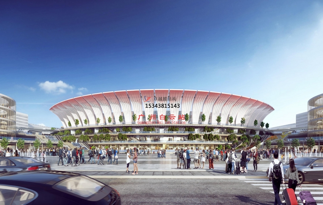 廣州白云站彩色PTFE膜結(jié)構(gòu)項(xiàng)目,單個(gè)膜花瓣單元采用白色和彩色膜材拼接技術(shù)。結(jié)構(gòu)上采用上下起伏的花蕾構(gòu)造,這使得膜材在張拉過(guò)程中,需要充分考慮摩擦對(duì)本項(xiàng)目預(yù)張力施加的困難。同時(shí)因?yàn)閱蝹€(gè)裁剪單元細(xì)長(zhǎng),寬度最寬約1.2m,長(zhǎng)度大37m,其沿線長(zhǎng)度方向整體需要焊接,所以焊接的應(yīng)力對(duì)本項(xiàng)目的影響尤為明顯。針對(duì)以上難點(diǎn),膜材進(jìn)場(chǎng)后,采用最先進(jìn)的雙軸拉伸設(shè)備對(duì)本項(xiàng)目的膜材進(jìn)行詳細(xì)的應(yīng)力與應(yīng)變關(guān)系的測(cè)試實(shí)驗(yàn),確保每一批次,每一張膜材在后期焊接接張拉過(guò)程中受力均勻,形態(tài)完美。