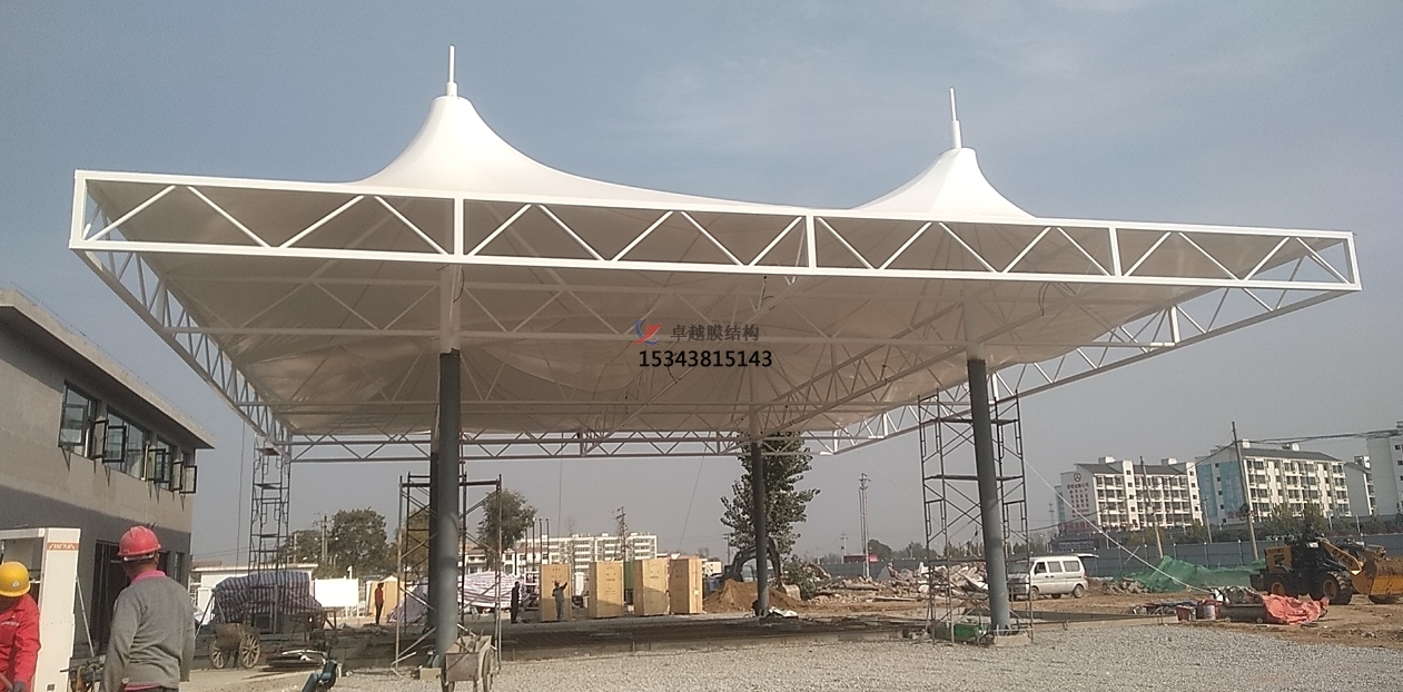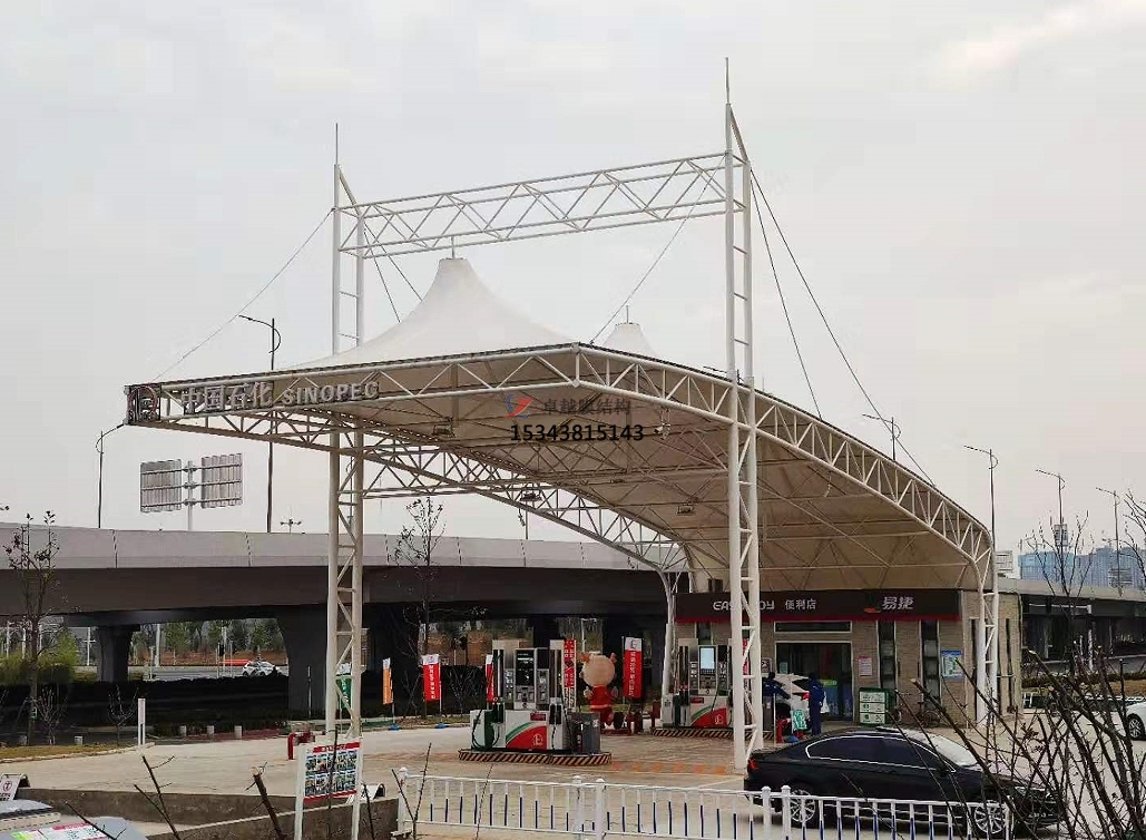 造型獨特:膜材料重量輕,適合加油站這種大跨度的建筑,而且是采用張力結構所以在造型設計上具有很大的優(yōu)勢,可以實現(xiàn)非常具有藝術氣息的造型。