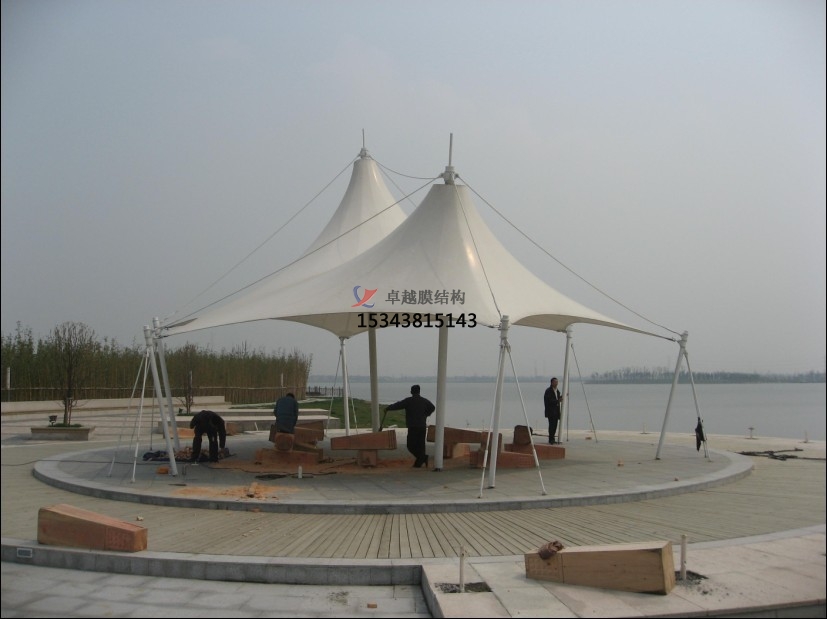 2膜結構造型優(yōu)美大方,使用年限也較長久,因此現(xiàn)在很多學校體育看臺采用了膜結構建筑,也是一個學校藝術性、獨特的建筑物,它大多采用半永久性的張拉膜結構的建筑體系,根據(jù)張拉膜結構可靠度設計統(tǒng)-標準,設計使用年限為5年的為臨時體育看臺遮陽棚, 10-30年為易 于替換的看臺膜結構??磁_膜結構或主席臺膜結構所用的PVC膜材能用10~25年, PTFE建筑膜材能用30年,張拉膜結構建筑在規(guī)定膜結構工程的使用年限內(nèi)應滿足的功能要求:自潔與建筑視覺效果,承受可能出現(xiàn)的各種作用,良好的各種性能,足夠的耐久性,經(jīng)歷偶發(fā)自然環(huán)境時仍能保持必須的整體穩(wěn)定性。
