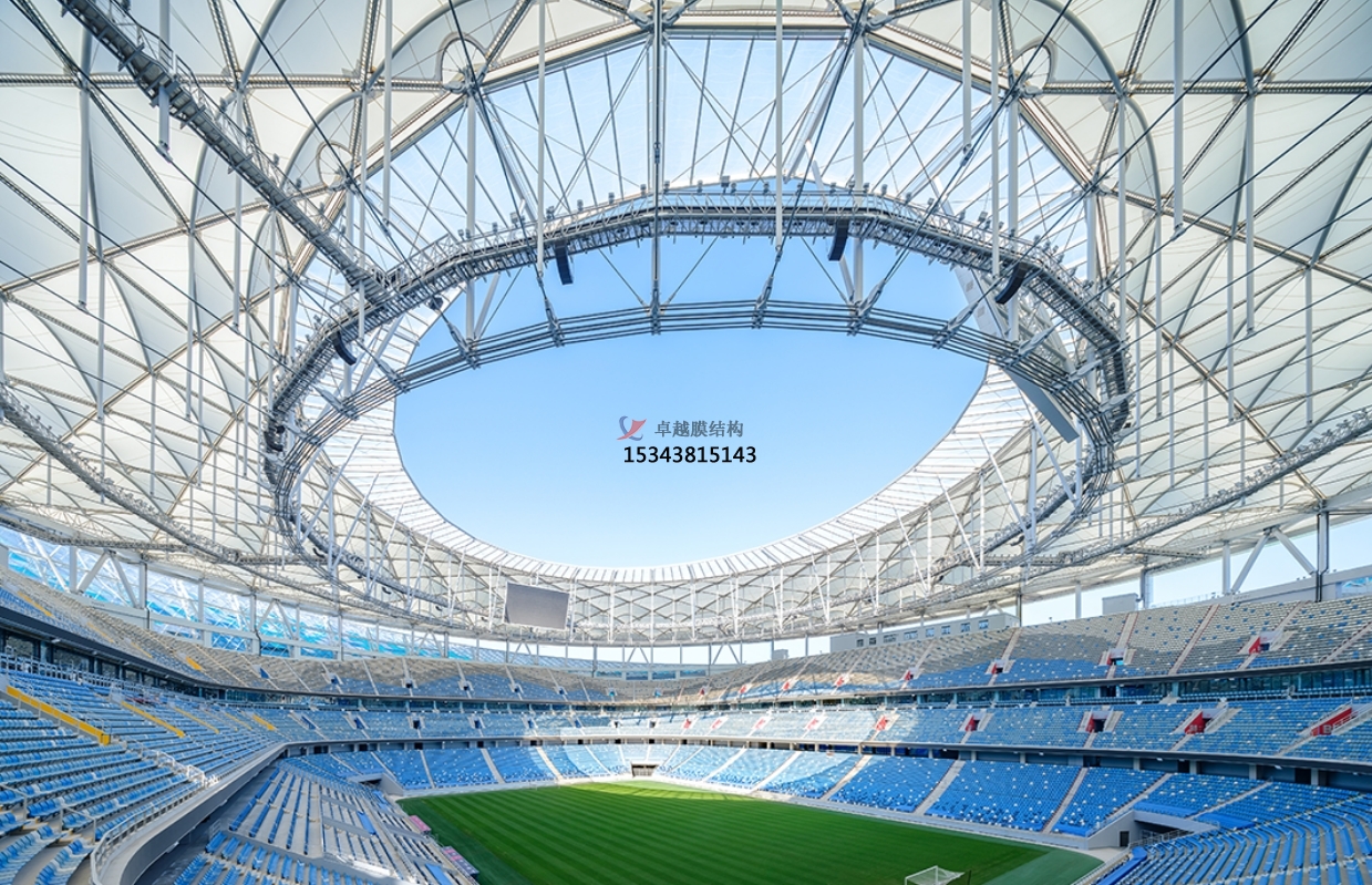 ETFE 膜的柔性特質(zhì)要求支撐結(jié)構(gòu)兼具強度與適應性。典型案例如廈門新體育中心,采用 “巨拱 + 車輻式索網(wǎng)” 體系,通過 40 榀索桁架與內(nèi)環(huán)索形成三維受力網(wǎng)絡,并在徑向索上方疊加獨立索網(wǎng),最終以 722 道托膜索與鋁合金槽實現(xiàn)膜面精準張拉。這種設計不僅滿足了 86 米高空作業(yè)的穩(wěn)定性需求,更通過曲面造型優(yōu)化了排水效率。