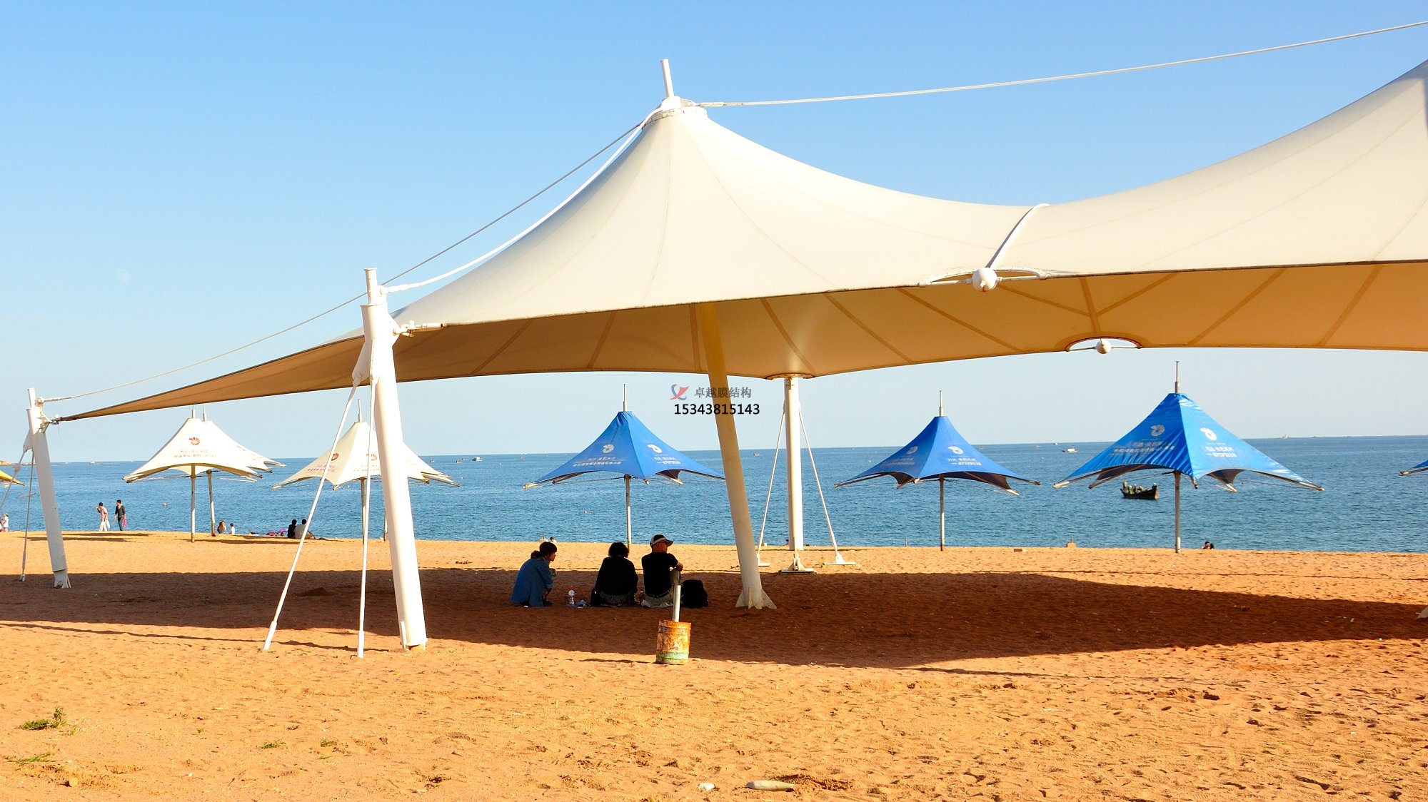 天津保稅區(qū)區(qū)標(biāo)。已經(jīng)成為中國膜結(jié)構(gòu)業(yè)界的里程碑,它標(biāo)志著中國膜結(jié)構(gòu)劃時(shí)代的開始,其中索膜結(jié)構(gòu)是此工程的重點(diǎn)內(nèi)容,44個(gè)獨(dú)立的膜結(jié)構(gòu)單元體和鋼結(jié)構(gòu)采用牽拉方式連接,面材為法國法拉利公司生產(chǎn)的型號(hào)為1002T。