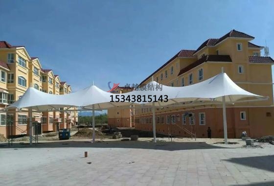 三、膜面坡度平緩處采取對(duì)策,預(yù)防膜面積水、積雪:商業(yè)廣場(chǎng)雨棚搭建需要盡可能保證膜面的排水坡度,但為了實(shí)現(xiàn)商業(yè)廣場(chǎng)雨棚搭建的大跨度,有可能存在膜面平緩的,為了防止膜面積水造成商業(yè)廣場(chǎng)雨棚搭建破壞事故,有時(shí)需要采取膜面開(kāi)溢流口的措施。
