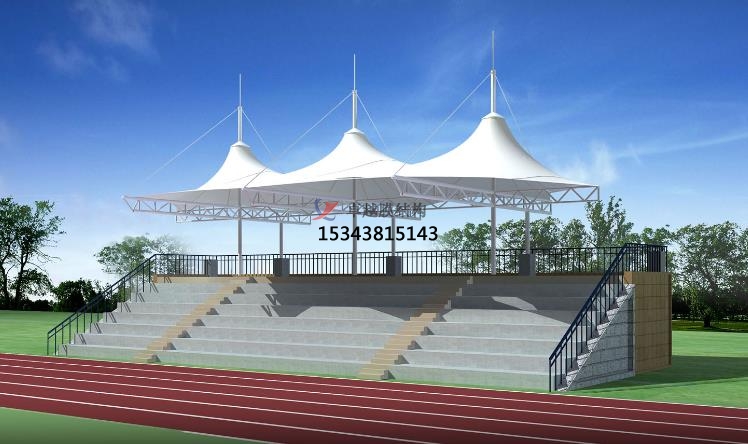 看臺張拉膜的功能:遮陽擋雨,環(huán)保節(jié)能,安全可靠,靈活定制??磁_張拉膜為觀眾提供了寬敞舒適的坐席,膜材透光性可提供所需照度,實(shí)現(xiàn)自然采光與人工采光結(jié)合,節(jié)省照明能耗,且夜間在燈光映射下形成絢麗景觀,同時具備遮陽擋雨的功能,確保在各種天氣條件下都能提供良好的觀賽體驗(yàn)。采用可回收材料,生產(chǎn)消耗資源少,能反射陽光降低內(nèi)部溫度,減少空調(diào)使用,符合綠色建筑理念。由于其輕質(zhì)特性,看臺張拉膜對基礎(chǔ)的需求較低,減少了建筑材料的消耗,高質(zhì)量張拉膜強(qiáng)度高、抗腐蝕性能佳,能抵御紫外線、風(fēng)霜雨雪等自然因素影響,長期使用無需頻繁大規(guī)模耗資維修保養(yǎng)??磁_張拉膜結(jié)構(gòu)設(shè)計(jì)要求合理安全,首先應(yīng)用支承結(jié)構(gòu)的穩(wěn)定性,方便張拉膜面時把握控制點(diǎn)空間位置及實(shí)施張拉,膜材撕裂時不至于結(jié)構(gòu)整體倒塌,更換膜面施工方便。然后利用水平力的傳遞,采用合適構(gòu)造措施確保作用于膜面的荷載以膜面張力形式通過邊界索經(jīng)膜角節(jié)點(diǎn)板傳遞到支承結(jié)構(gòu)或基礎(chǔ)時,水平力可靠傳遞。其次利用結(jié)構(gòu)體系內(nèi)力的自平衡,將支承結(jié)構(gòu)體系設(shè)計(jì)成自平衡體系,減少膜面張力對下部結(jié)構(gòu)或地基的影響。最后根據(jù)結(jié)構(gòu)單元的重復(fù)與組合,利用基本外形的機(jī)構(gòu)單元組合形成大面積覆蓋空間時,注意膜面的熱合線在連接處要對齊,形成連續(xù)、流暢視覺效果。膜材料和支撐構(gòu)件經(jīng)嚴(yán)格檢測認(rèn)證,設(shè)計(jì)施工考慮防火、防腐蝕等安全因素,結(jié)構(gòu)穩(wěn)定性好,發(fā)生意外坍塌危險性小。看臺張拉膜可以根據(jù)具體需求進(jìn)行量身定制,適應(yīng)各種形狀和尺寸,完美契合不同場合。