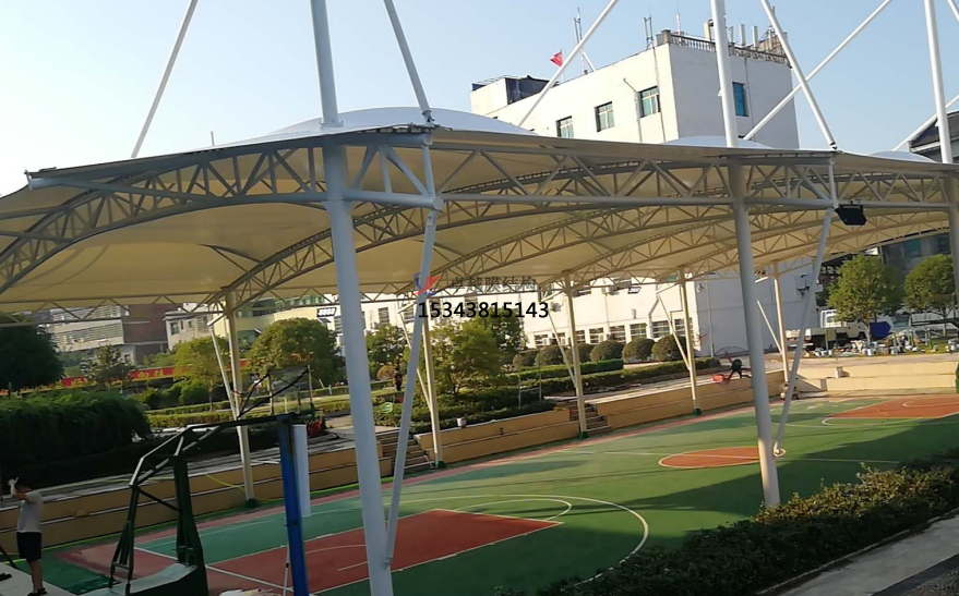 安裝支架:按照設計圖紙和尺寸要求,使用螺絲和螺母將雨棚支架固定在籃球場地面上。