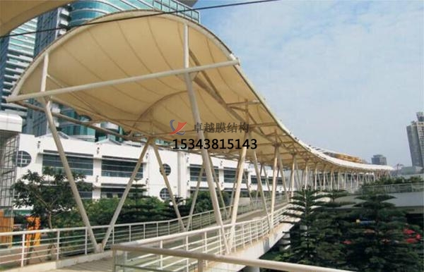 以膜材、鋼索及支柱構(gòu)成,利用鋼索與支柱在膜材中導(dǎo)入張力以達(dá)安 定的形式。除了可實(shí)踐具創(chuàng)意,創(chuàng)新且美觀的造型外,也是能展現(xiàn)膜結(jié) 構(gòu)精神的構(gòu)造形式. 大型跨距空間也多采用以鋼索與壓縮材構(gòu)成鋼索網(wǎng)來支撐上部膜材的形式。因施工精度要求高,結(jié)構(gòu)性能強(qiáng),且具豐 富的表現(xiàn)力,所以造價(jià)略高于骨架式膜結(jié)構(gòu)景觀。