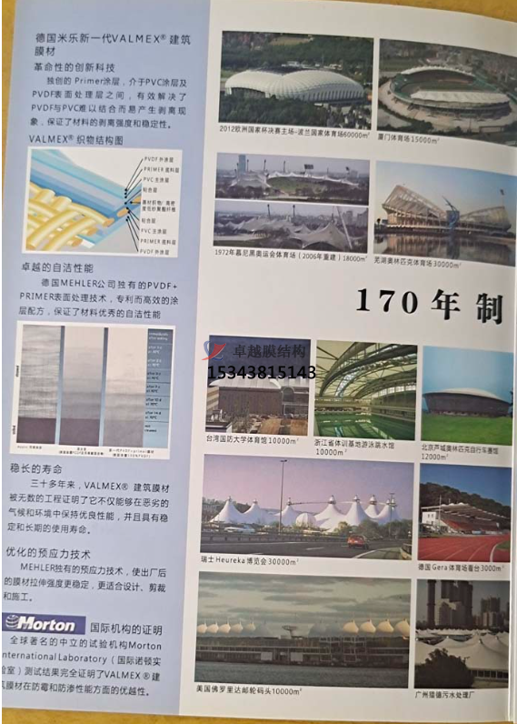 德國MEHLERHAKU米樂公司擁有165年(1837年一2003年)的制造業(yè)經(jīng)驗。通過1S09001質(zhì)量體系認證,所有產(chǎn)品均經(jīng)過嚴(yán)格的DIN德國工業(yè)標(biāo)準(zhǔn),以及各個國家的膜材工業(yè)標(biāo)準(zhǔn)。2002年,德國米樂公司獲聘為中華人民共和國建設(shè)部《索膜建筑結(jié)構(gòu)制品》行業(yè)標(biāo)準(zhǔn)編制委員成員。德國米樂的產(chǎn)品系列涵蓋環(huán)保等各種PVC膜材領(lǐng)域,包括:建筑工程、輕型結(jié)構(gòu)、廣告、遮陽、汽艇、軍用、裝飾、水利環(huán)保,等等。