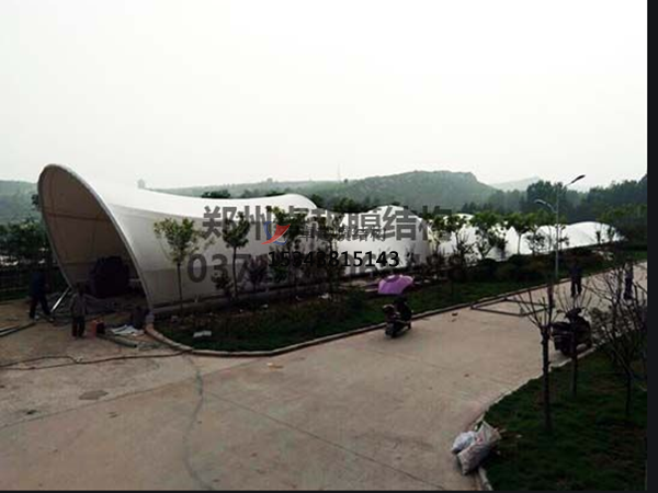 4、輕巧而漂亮的膜結(jié)構(gòu)用于打開或半打開修建物的遮蓋屋蓋尤為適宜。近年來(lái)在足球、田徑等比賽的體育場(chǎng)中,越來(lái)越多的看臺(tái)挑蓬都選用膜結(jié)構(gòu)。國(guó)外很大露天劇院的舞臺(tái)、博覽會(huì)的展覽館也都以膜作為頂蓋。在我國(guó)廣闊區(qū)域是農(nóng)貿(mào)市場(chǎng)也可大力推廣膜結(jié)構(gòu)。