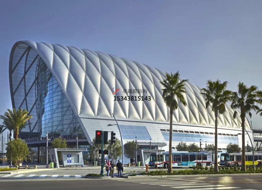 美國南加州新一代公共交通設(shè)施:阿納海姆地區(qū)聯(lián)合運輸中心。阿納海姆地區(qū)聯(lián)合運輸中心建筑面積為67000平方英尺,建筑表皮采用菱形鋼拱的網(wǎng)格結(jié)構(gòu)系統(tǒng),由ETFE氣枕膜結(jié)構(gòu)組成。大跨度的網(wǎng)殼結(jié)構(gòu)創(chuàng)造的中庭空間寬敞明亮,可容納川流不息的人群。ETFE穹頂和膜結(jié)構(gòu)幕墻,一掃傳統(tǒng)火車站繁冗、沉重、空間昏暗的弊端,帶來一股清新簡潔的交通設(shè)施建筑風格。