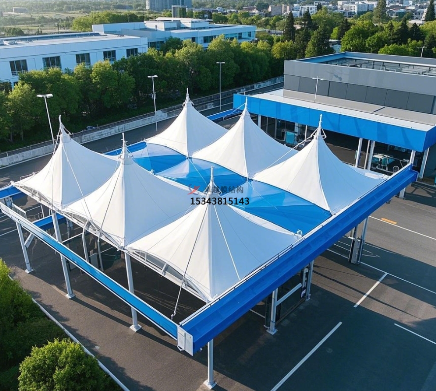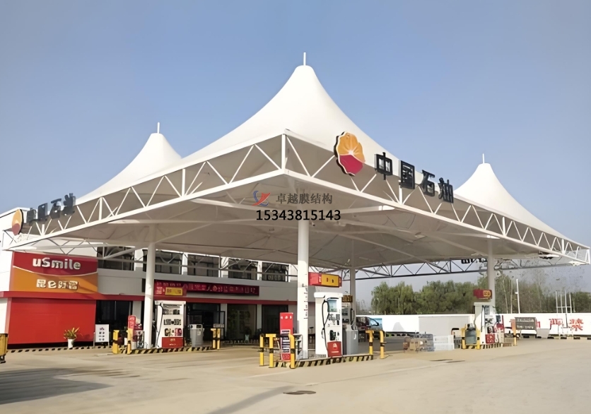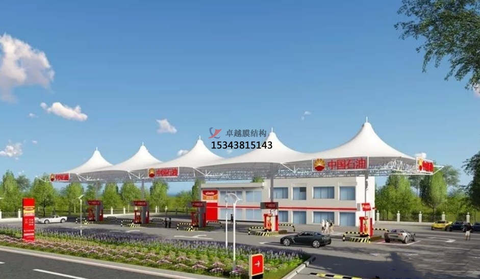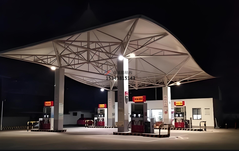 美觀與個(gè)性化:膜結(jié)構(gòu)頂棚設(shè)計(jì)靈活多樣,可根據(jù)加油站的整體風(fēng)格與周邊環(huán)境,定制各種獨(dú)特的形狀和顏色。無(wú)論是流暢的曲線造型,還是富有現(xiàn)代感的幾何形狀,都能為加油站增添獨(dú)特魅力,提升其整體美觀度與辨識(shí)度,成為城市道路上一道亮麗的風(fēng)景線。