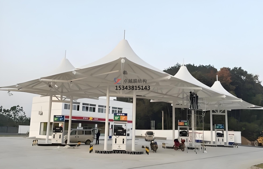 膜結(jié)構(gòu)頂棚能夠塑造出豐富多樣、極具現(xiàn)代感的造型。它既可以呈現(xiàn)出流暢的曲線形態(tài),如優(yōu)雅的風(fēng)帆,為加油站增添一份靈動(dòng)與飄逸,仿佛在訴說(shuō)著能源流動(dòng)的活力;也可以設(shè)計(jì)成簡(jiǎn)潔大氣的幾何形狀,如規(guī)整的方形或多邊形組合,展現(xiàn)出一種簡(jiǎn)潔、硬朗的工業(yè)美感,與加油站的功能性相得益彰。不同的造型設(shè)計(jì)能夠契合不同加油站的定位與周邊環(huán)境風(fēng)格,成為所在區(qū)域的獨(dú)特標(biāo)識(shí)。