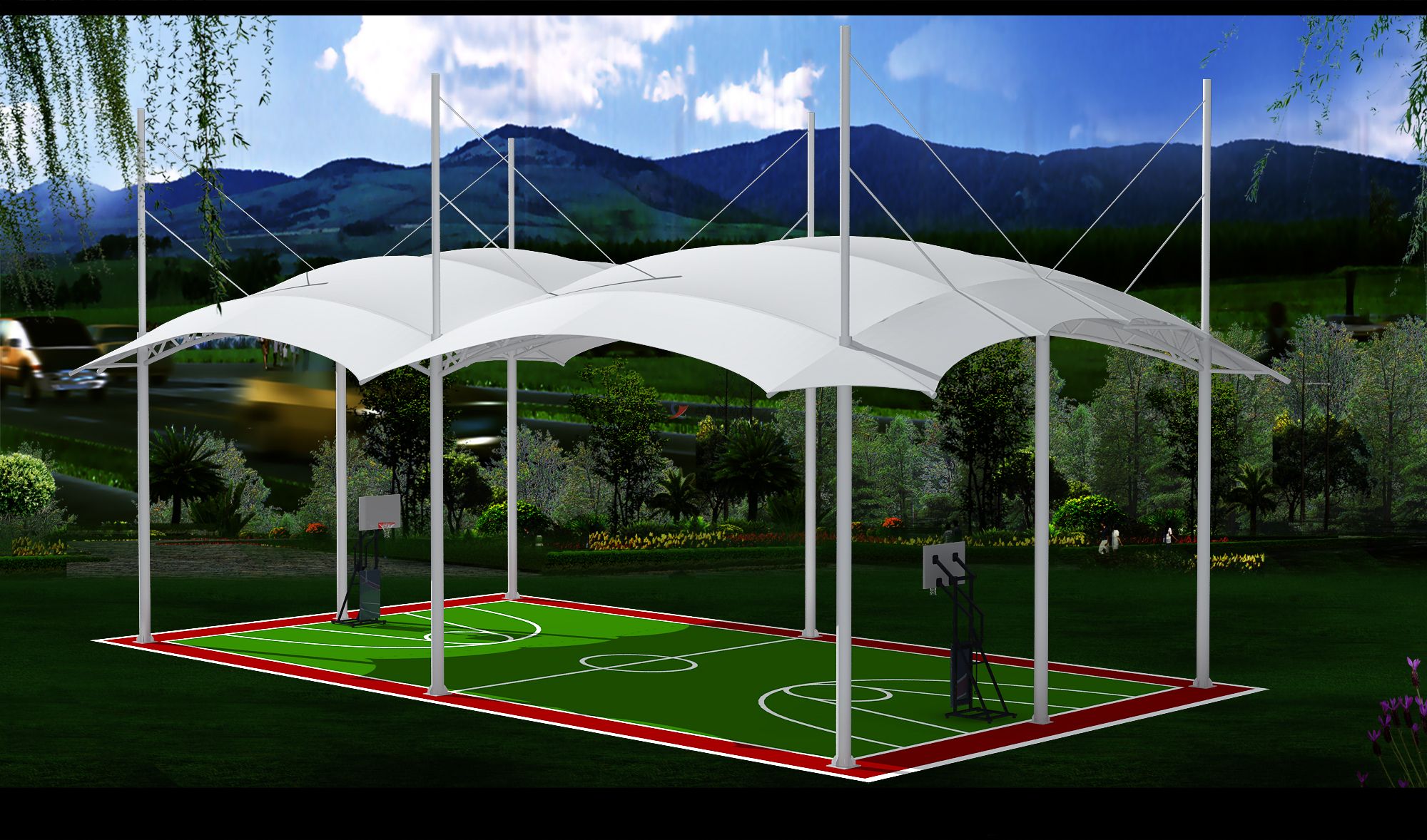 工程結(jié)構(gòu)形式:骨架式膜結(jié)構(gòu)羽毛球館,四面自然排水。