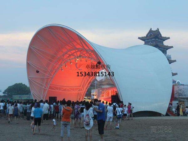 1、混凝土結(jié)構(gòu)主體加鋼拱以上兩種更簡(jiǎn)單的膜結(jié)構(gòu),依平面的形狀,如方形、菱形等,可有許多變化,拱的間距依使用的膜材強(qiáng)度、設(shè)計(jì)荷載、風(fēng)力等確定。