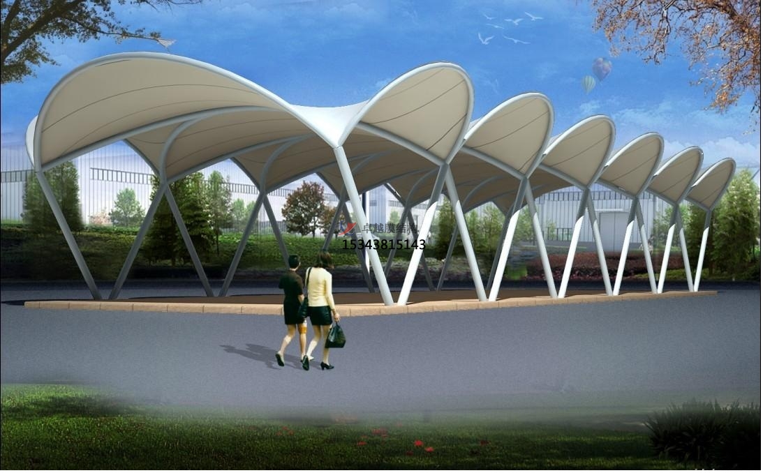 其三、藝術(shù)性:除了一般雨蓬不行比較的有用、經(jīng)用、遮風(fēng)擋雨的功用外,膜結(jié)構(gòu)工程更是一座雕塑 ,一件藝術(shù)品,給人美的視覺享受。其柔美,其曲線,其剛?cè)岵?jì),其豐富外型,其潔白無瑕,讓人眼前-亮,回味悠長。