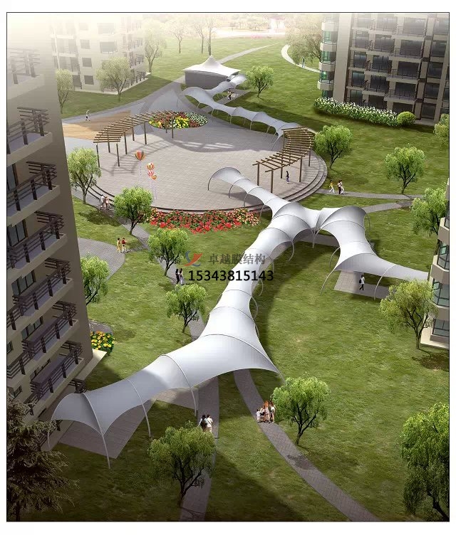 二是覆蓋大跨度空間,膜結構由于自重輕,加上鋼索、鋼結構高強度材料的應用,通過合理的設計受力體系,簡潔合理,故使膜結構適合跨越較大跨度空間,從而形成開闊的無柱大跨度結構體系工程。三是防火性和抗震性,膜結構建筑所采用的膜材具有助燃性和耐高溫性,能很好的滿足防火要求。由于自重輕,柔性強,故抗震性能好。四是施工工期短,由于骨架的鋼結構和膜材裁剪可以在工廠加工制作,現(xiàn)場只需要組裝,施工簡便快捷,施工周期較傳統(tǒng)建筑短。