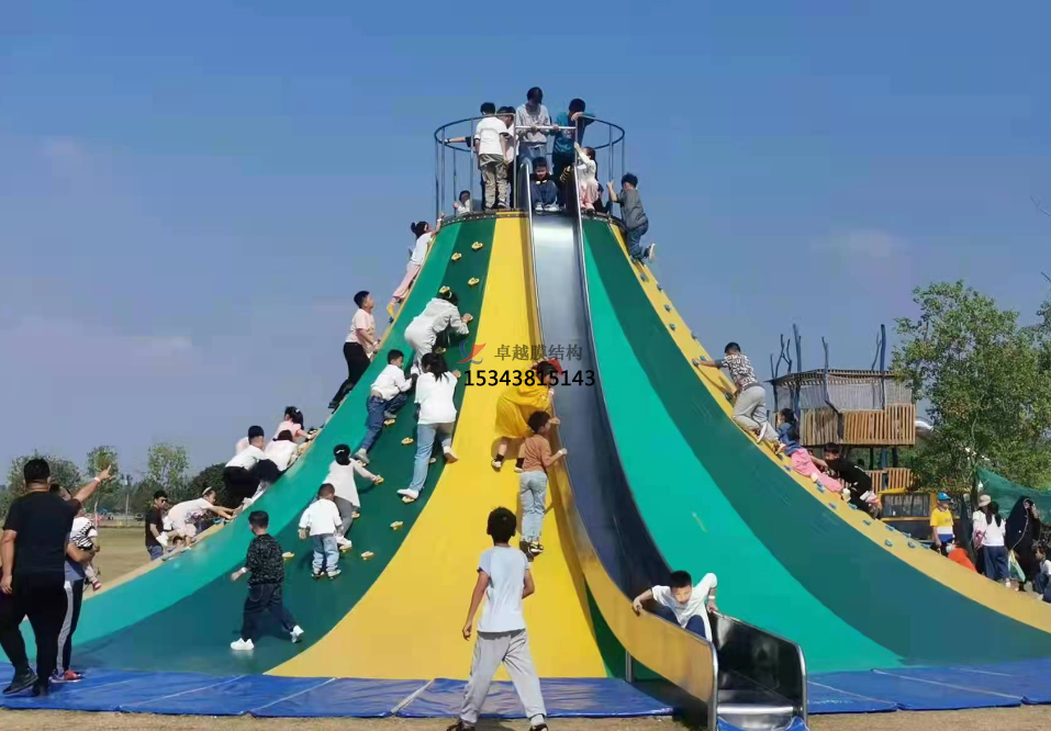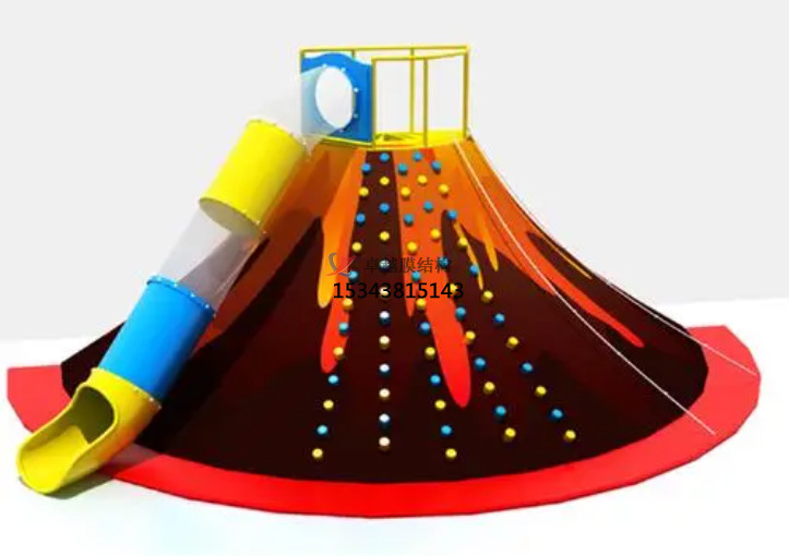 火山攀巖設(shè)備頂部可以設(shè)置滑梯,滑梯與膜結(jié)構(gòu)的火山造型相結(jié)合。當(dāng)游玩者從“火山”頂部通過滑梯滑下時(shí),滑梯自身的落差感,可以讓游玩者感受到從高處滑下過程中的興奮感和刺激感。膜結(jié)構(gòu)的存在為滑梯的設(shè)置提供了一種創(chuàng)意性的平臺(tái),使整個(gè)游樂體驗(yàn)更加豐富多樣。