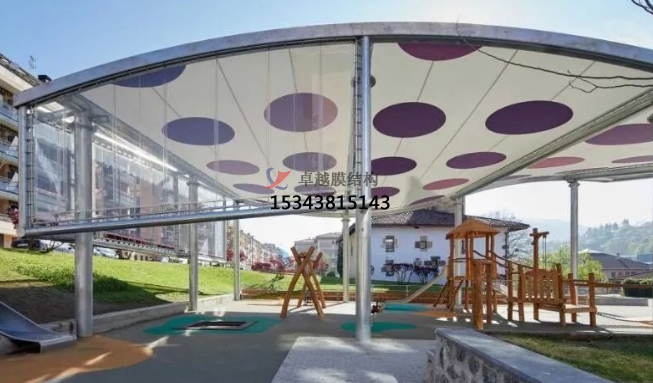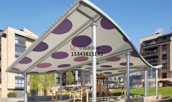 兒童游樂場(chǎng)所本就是趣致可愛的,迎合孩子們的喜好,配套遮陽設(shè)施的建設(shè)也應(yīng)該考慮在內(nèi),下面兩個(gè)遮陽項(xiàng)目屬于同一系列,波點(diǎn)圖案,活潑的色調(diào),再加上起伏的造型,讓人感覺輕松愉快。兩個(gè)項(xiàng)目都采用PVC+ETFE膜材。