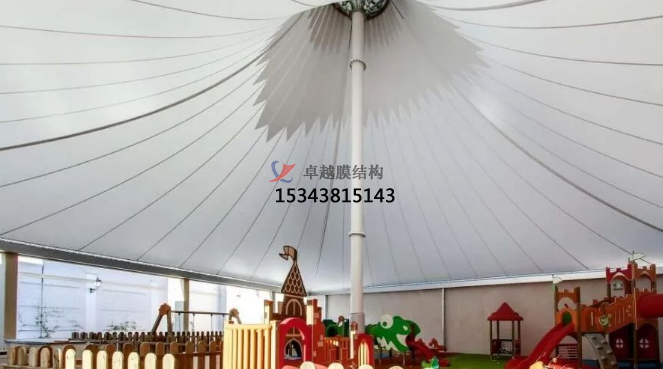 這是一個超450平米的兒童游樂場,于上方覆蓋一把膜結(jié)構(gòu)“大傘",采用白色PVC膜材,大傘中央以一根鋼管支撐,營造了一個明亮開闊無遮擋的安全性空間。