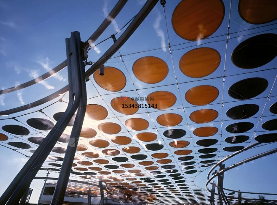 景觀膜結(jié)構(gòu)主要由膜材、骨架系統(tǒng)與支撐系統(tǒng)協(xié)同構(gòu)成。膜材作為核心部分,多選用聚酯纖維、聚氯乙烯等材料。聚酯纖維膜材強(qiáng)度高,能有效抵御外界拉力,保障結(jié)構(gòu)穩(wěn)固;聚氯乙烯膜材則具備良好的柔韌性與可塑性,可輕松塑造出各種復(fù)雜造型。同時(shí),這些膜材還擁有出色的耐久性,能經(jīng)受住長(zhǎng)時(shí)間的風(fēng)吹日曬、雨水侵蝕,確保景觀膜結(jié)構(gòu)的長(zhǎng)期使用。