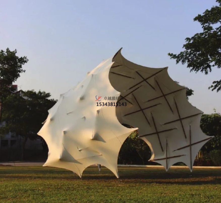 輕質(zhì)高強(qiáng),穩(wěn)固耐用:景觀膜結(jié)構(gòu)采用的高強(qiáng)度薄膜材料,重量?jī)H約為傳統(tǒng)建筑結(jié)構(gòu)材料的十分之一,極大地減輕了自身重量。但 “輕量級(jí)” 的它卻有著超乎想象的強(qiáng)大實(shí)力,拉伸強(qiáng)度極高,在面對(duì)風(fēng)荷載與雪荷載時(shí),能憑借出色的韌性與剛性,展現(xiàn)卓越的穩(wěn)定性。在強(qiáng)風(fēng)天氣中,膜結(jié)構(gòu)可通過(guò)自身的柔性變形來(lái)緩沖風(fēng)力,避免因剛性抵抗而導(dǎo)致結(jié)構(gòu)損壞;面對(duì)積雪,其合理的造型與支撐設(shè)計(jì)能使積雪均勻分布或自然滑落,防止因積雪過(guò)重造成坍塌,為景觀設(shè)施提供可靠的安全保障。