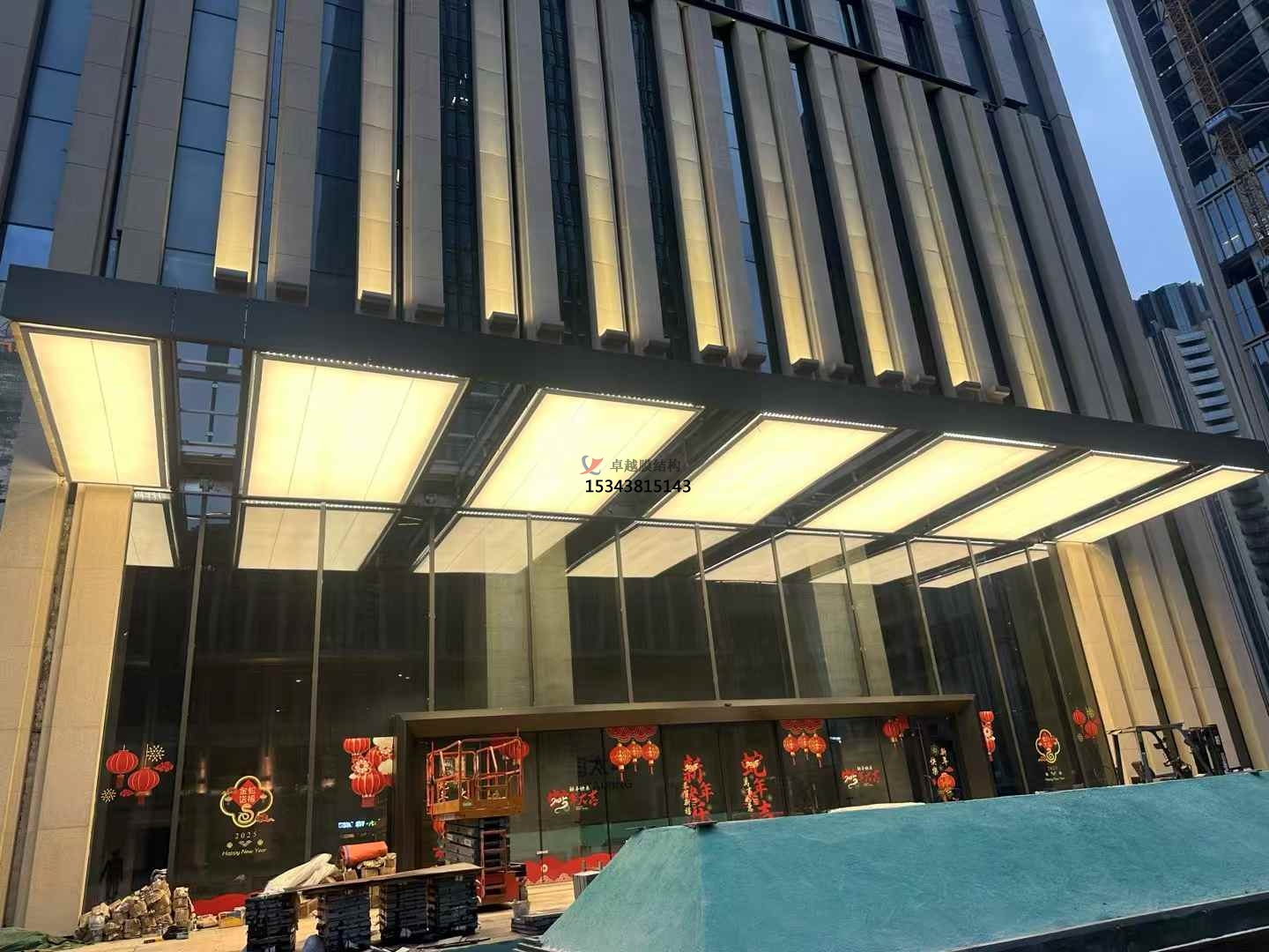 - 膜材張緊:在膜材固定和連接完成后,通過調(diào)整支撐結(jié)構(gòu)或使用專門的張緊設(shè)備,對膜材進行張緊,使其達到設(shè)計要求的張力狀態(tài)。張緊過程中要密切關(guān)注膜材的變形情況,確保其變形在允許范圍內(nèi),且膜面平整、無褶皺。同時,要使用測量儀器對膜材的張力進行監(jiān)測和控制,保證各部位的張力符合設(shè)計值。