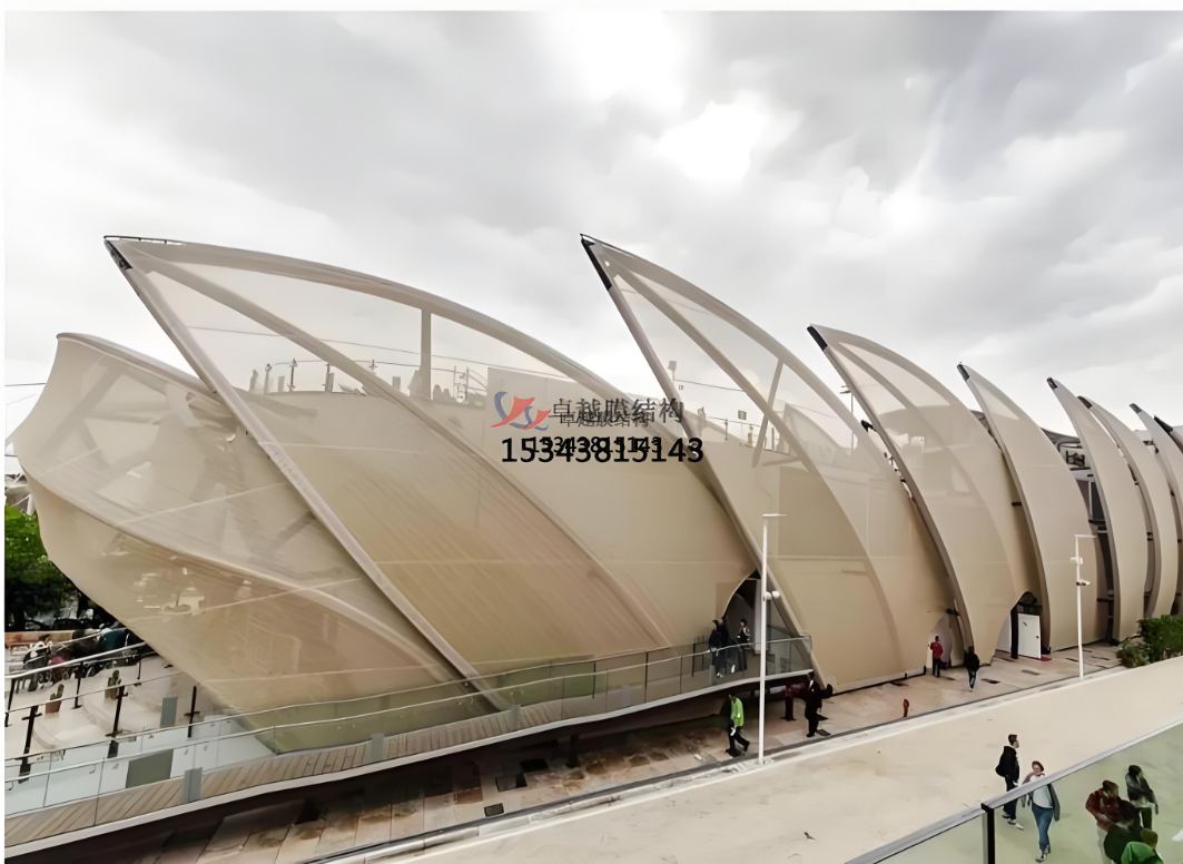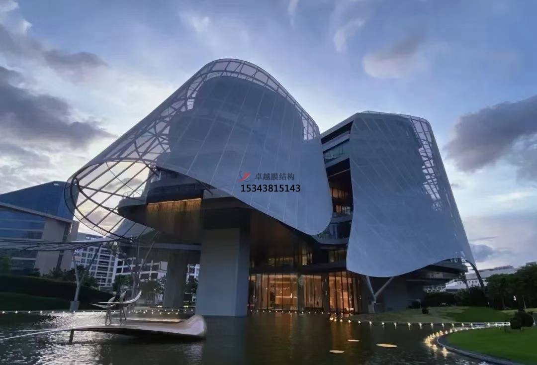可塑性:膜材柔軟,可塑性強,可以被拉伸成為各種動態(tài)感強的形狀,配合膜結構可以實現(xiàn)各種突破傳統(tǒng)模式的造型,創(chuàng)造大面積無柱覆蓋的空間。