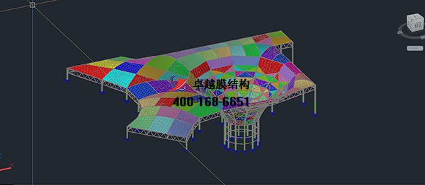 膜結(jié)構(gòu)設(shè)計(jì)時(shí),應(yīng)在滿(mǎn)足膜面應(yīng)力平衡狀態(tài)的條件下,使結(jié)構(gòu)體系保持穩(wěn)定。還應(yīng)考慮使用階段局部膜片破壞或局部索退出工作,以及對(duì)不同部位膜單元進(jìn)行二次張拉或更換對(duì)整體結(jié)構(gòu)的影響。