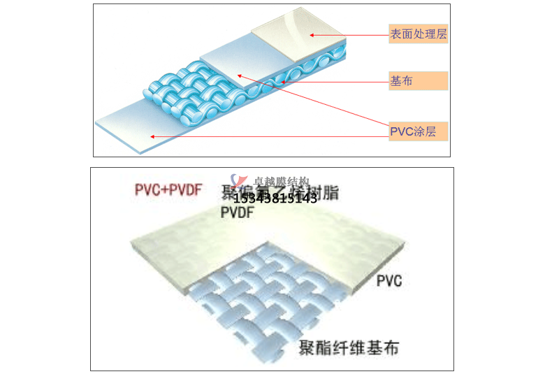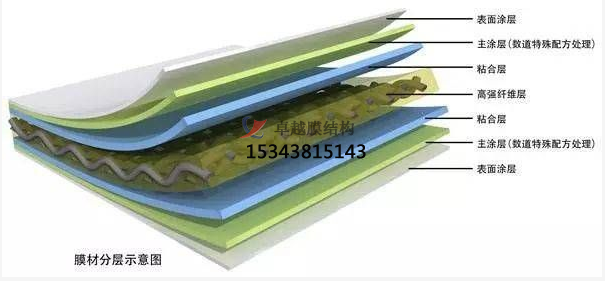 PVDF膜材加工是在聚酯纖維基布上涂上Pv(聚氬乙烯)樹(shù)酯后加上100%PVDF(聚偏氟乙烯)表面涂層而成的復(fù)合材料。PVDF膜權(quán)由于自潔性良好、價(jià)格適中、運(yùn)輸安裝方使,更廠泛應(yīng)用于各類(lèi)建筑領(lǐng)域。它的壽命因不同的表面涂層而異,一股可達(dá)成10-25年,其構(gòu)造形式見(jiàn)下圖: