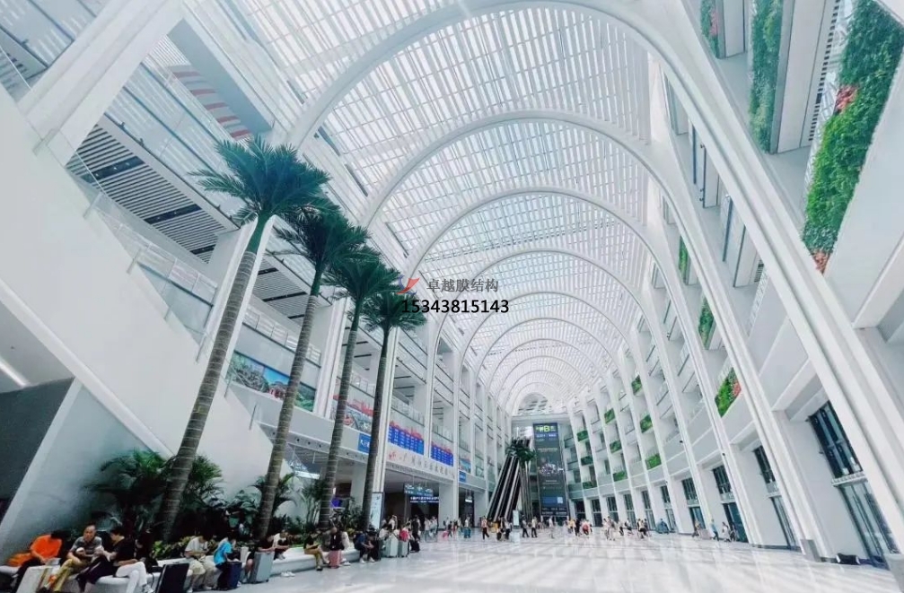 在功能方面,高鐵站膜結(jié)構(gòu)具有良好的透光性和隔熱性。膜材的透光率一般在 10% - 20% 之間,能夠使自然光均勻地進(jìn)入室內(nèi),為候車大廳提供充足的自然光照,減少了對人工照明的依賴,從而節(jié)約了能源。同時,膜材還具有良好的隔熱性能,能夠有效地阻擋太陽輻射熱,降低室內(nèi)溫度,為旅客創(chuàng)造一個舒適的候車環(huán)境。
