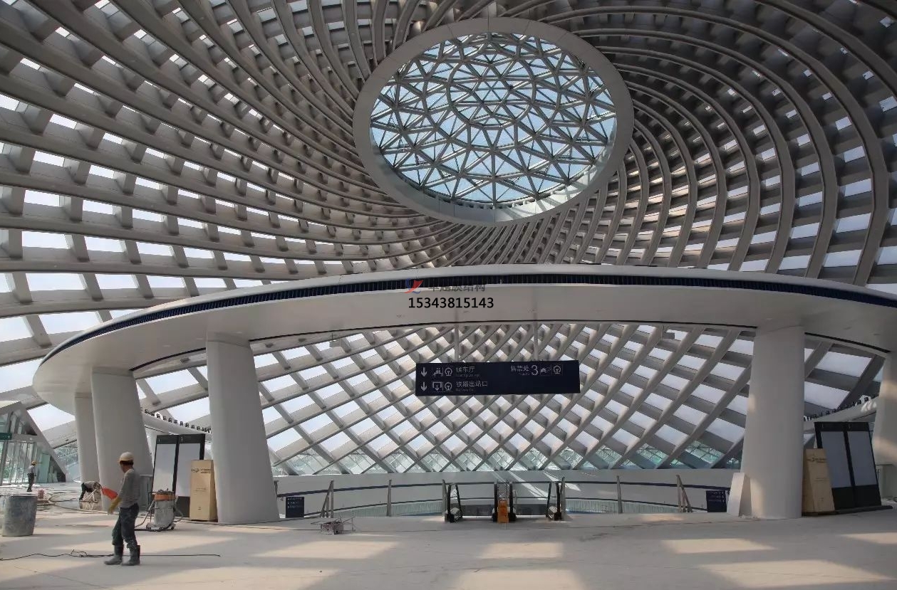 高鐵站膜結(jié)構(gòu)是一種新型的建筑結(jié)構(gòu)形式,它采用高強度柔性薄膜材料與支撐體系相結(jié)合,通過一定的技術(shù)手段,使其內(nèi)部產(chǎn)生一定的預(yù)張力,從而形成具有一定剛度和穩(wěn)定性的空間結(jié)構(gòu)體系。這種結(jié)構(gòu)形式具有重量輕、跨度大、造型美觀、施工速度快等優(yōu)點,能夠滿足高鐵站大空間、大跨度的建筑需求。