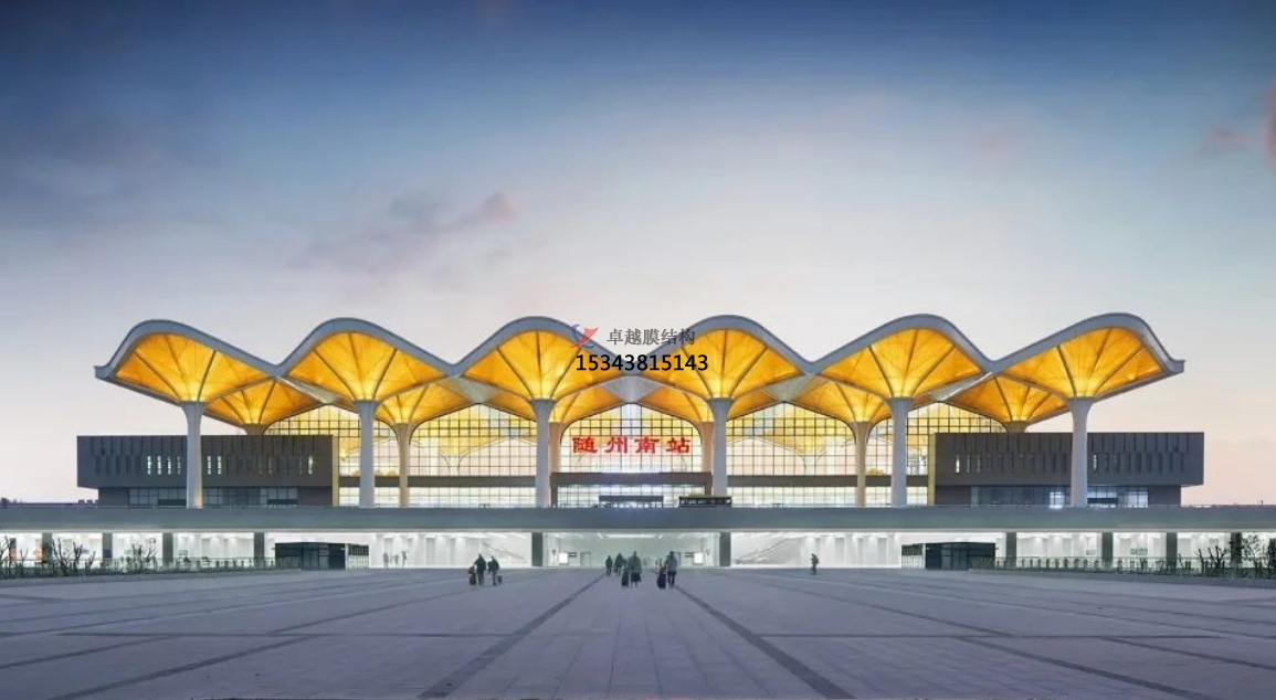 隨州高鐵站:隨州高鐵站站房采用了膜結(jié)構(gòu)設(shè)計,通過驗算不同膜材的最大適用跨度,最終選用了滿足要求的膜材方案。該站房膜結(jié)構(gòu)造型獨特,既美觀又實用,成為隨州市的新地標。