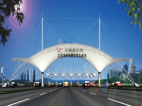 膜結(jié)構(gòu)建筑因其獨(dú)特的藝術(shù)性,優(yōu)美的造型,濃郁的現(xiàn)代氣息,被廣泛運(yùn)用到建筑領(lǐng)域的各種設(shè)施。收費(fèi)站膜結(jié)構(gòu)運(yùn)用在收費(fèi)站頂蓬上是再合理不過(guò)的選擇,因?yàn)槭召M(fèi)站的頂篷是公路或地區(qū)設(shè)置名稱(chēng)標(biāo)牌的主要位置,是公路或地區(qū)的重要標(biāo)志;大跨度的膜結(jié)構(gòu)在這種場(chǎng)合下的運(yùn)用,能充分體現(xiàn)膜結(jié)構(gòu)的主要特點(diǎn),并有較好的標(biāo)識(shí)招攬效果。為相關(guān)的道路或區(qū)域起到畫(huà)龍點(diǎn)睛的作用。