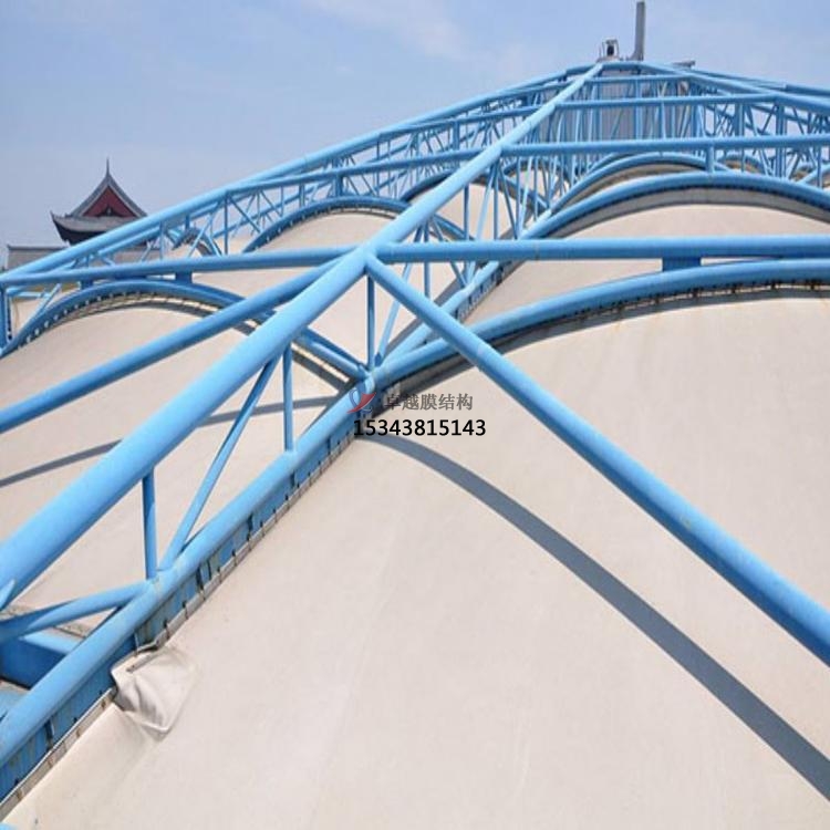 鋼架反吊膜結(jié)構(gòu)是專門用于污水池加蓋密閉的一種膜結(jié)構(gòu)形式,結(jié)構(gòu)形式新穎,防腐耐霉,由鋼結(jié)構(gòu)、膜結(jié)構(gòu)及安裝輔件構(gòu)成,根據(jù)不同污水池現(xiàn)場條件進行個性化設(shè)計安裝。鋼結(jié)構(gòu)在外部形成穩(wěn)定受力結(jié)構(gòu),膜材料反吊與機構(gòu)內(nèi),隔絕廢氣對剛架構(gòu)的腐蝕。鋼架反吊膜分為圓形反吊膜和方形反吊膜,其中方形反吊膜又分為拱形及吊帽結(jié)構(gòu)。