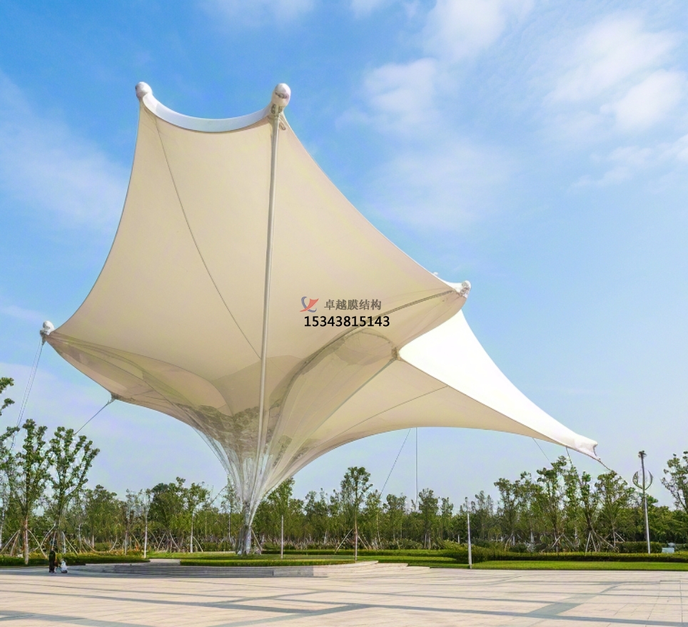 這些膜材共有的特性賦予了景觀膜結(jié)構(gòu)一種輕盈而靈動(dòng)的視覺效果。相較于傳統(tǒng)的建筑材料,膜材的重量微乎其微,卻擁有驚人的張力承受能力,宛如一張堅(jiān)韌的“皮膚”,能夠被拉伸成各種充滿創(chuàng)意的形狀。這種輕質(zhì)特性不僅有效降低了基礎(chǔ)設(shè)施建設(shè)成本和施工難度,還使得膜結(jié)構(gòu)能夠在特殊地形或荷載限制嚴(yán)格的區(qū)域得以應(yīng)用,從而極大地豐富了景觀設(shè)計(jì)的可能性。