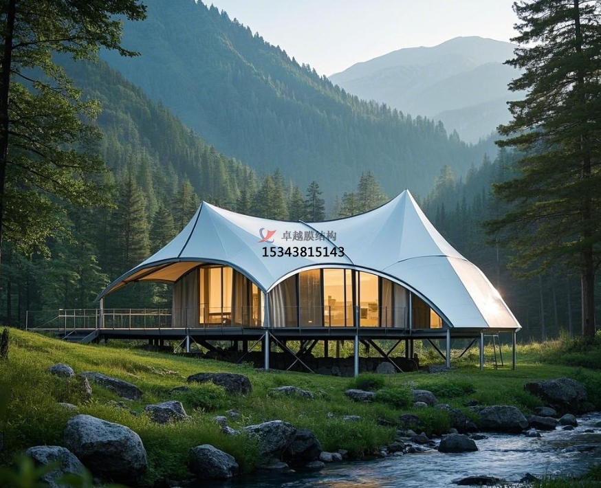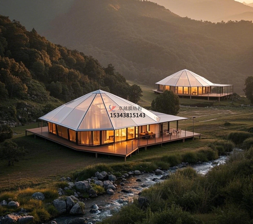 在環(huán)保意識日益增強的當下,帳篷酒店膜結構優(yōu)勢顯著。一方面,膜材具有良好的保溫隔熱性能,有效減少室內外熱量傳遞,降低空調、供暖設備能耗。另一方面,部分膜材如 ETFE 膜材透光性佳,可充分利用自然采光,減少白天人工照明使用,節(jié)約能源。此外,膜結構建筑在材料選擇上注重可回收利用,符合綠色建筑發(fā)展要求,為可持續(xù)旅游貢獻力量。