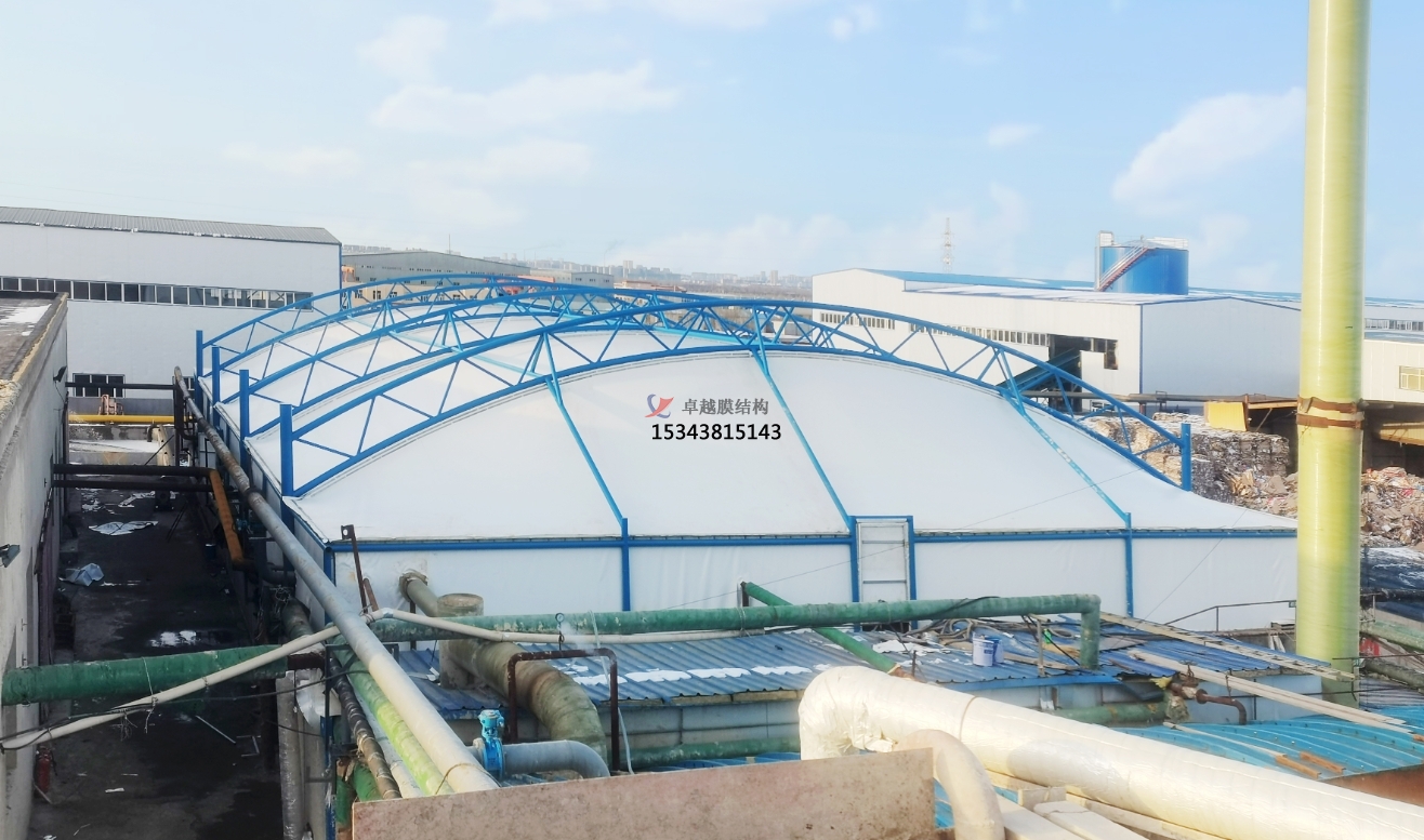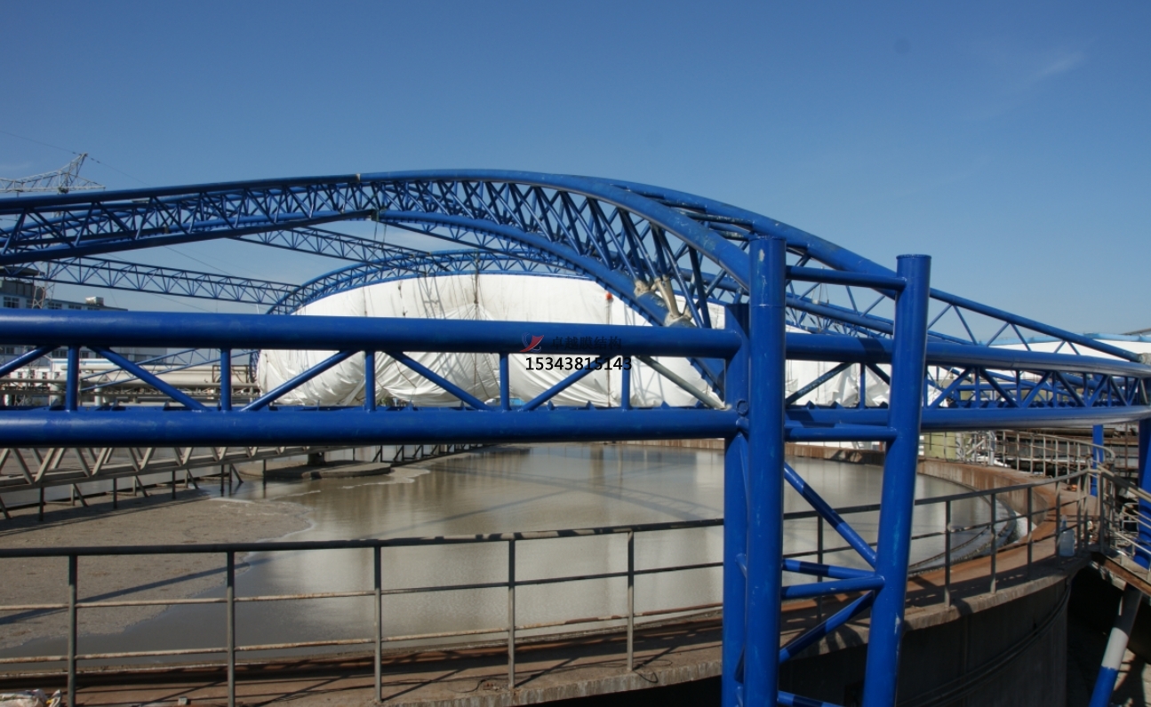 隨著工業(yè)技術(shù)的不斷成熟,污水池加蓋一般采用反吊膜結(jié)構(gòu)形式,對污水池內(nèi)廢氣進(jìn)行處理。這種結(jié)構(gòu)采用膜材反吊的原理,將鋼結(jié)構(gòu)至于膜材外層,這樣,就有效的避免了池內(nèi)廢氣對鋼結(jié)構(gòu)的腐蝕,延長了鋼結(jié)構(gòu)的使用壽命,提高了反吊膜結(jié)構(gòu)的廢氣除臭率。
