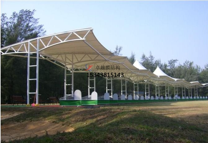 景觀膜結(jié)構(gòu)遮陽棚膜材,是由纖維編織成織物基材,在其基材兩面以樹脂為涂層材所加工固定而成的材料,中心的織物基材分為聚酯纖維及玻璃纖維,涂層材使用的樹脂有聚氯乙烯樹脂(PVC),聚四氟乙烯樹脂(PTFE),二氟化樹脂(PVDF)等。