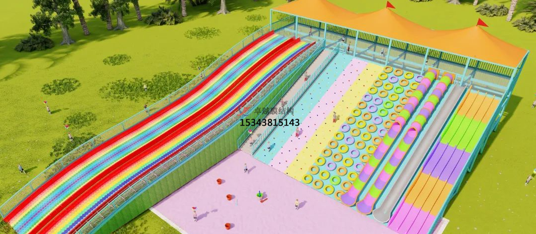 在張拉膜頂下方安裝彩虹滑道,滑道長(zhǎng)度可根據(jù)客戶要求定制,一般可達(dá)120米?;啦捎梅阑?、耐磨的材料,保證游客的安全。