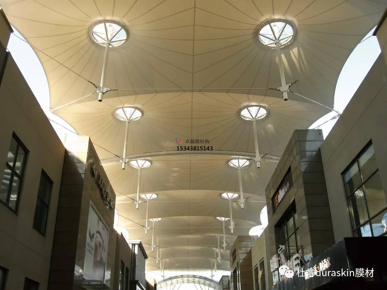 建筑入口使城市公共空間與建筑空間相鄰的界面,成為城市空間的組成部分。它是人們視覺最先接觸的部分,因此,除了功能以外,還應(yīng)有很強(qiáng)的標(biāo)識(shí)性,并能體現(xiàn)建筑的個(gè)性,是建筑環(huán)境和城市景觀的重要組成部分。由于膜結(jié)構(gòu)自然的曲線美是其他結(jié)構(gòu)類型無(wú)法比擬的,故成為近來(lái)建筑入口及屋頂經(jīng)常采用的形式。