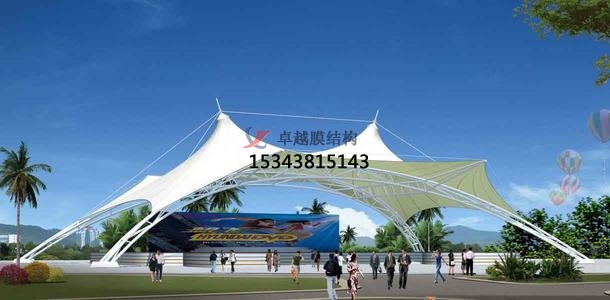 用于張拉膜景觀中的高強(qiáng)度柔韌薄膜稱膜材,它是一種耐久用、高強(qiáng)度的涂層織物,由織物和涂層復(fù)合而成,具有質(zhì)地柔韌、厚度小、重量輕、透光性好的特點(diǎn)。對自然光吸收和透射能力、阻燃,具有良好的耐久、防火、氣密等特性;